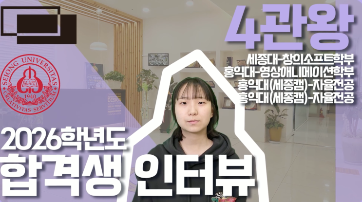 일산 애니창아 2026학년도 4관왕 합격생 인터뷰 우리 애니창아에 4관왕이 나왔다는 소식 다들 알고 계신가요? 하나의 대학도 붙기 어려운 상황에 4곳의 합격 결과를 만들어낸 4관왕 합격자! 그것도 상위권에 해당하는 세종대 창의소프트 학부 홍익대 - 영상애니메이션 학부 홍익대(세종캠퍼스) 자율전공 - 교과 우수자전형 홍익대(세종캠퍼스) 자율전공 - 학교생활 우수자전형 우리 친구들도 그 합격 비법이 궁금하실듯 하여, 애니창아에서 귀한 분을 모셔 인터뷰를 하였습니다! 그럼 함께 인터뷰 내용을 감상해볼까요? Q. 애니쪽 분야로 진로를 잡게 된 계기는? 어렸을때 부터 그림 그리기와 만화, 애니메이션을 좋아 하기도 했고요. 결정적인 계....... <img src="https://blogthumb.pstatic.net/MjAyNjAyMTNfMTg1/MDAxNzcwOTg0ODQxNDM0.R4NdT0D2eg50-Fhm_7BrT1EBOT50iGMD8YYrlCnKIZEg.Wp9hHn5HKfOd3vO_GNX6Xfj7uI975-TPHpw3wyzf6gwg.PNG/%C0%CF%BB%EA%B8%B8%C8%AD%C7%D0%BF%F8_%BE%D6%B4%CF%C3%A2%BE%C6_4%B0%FC%BF%D5_2026-02-13_%BF%C0%C8%C4_9.07.08.png?type=s3" />