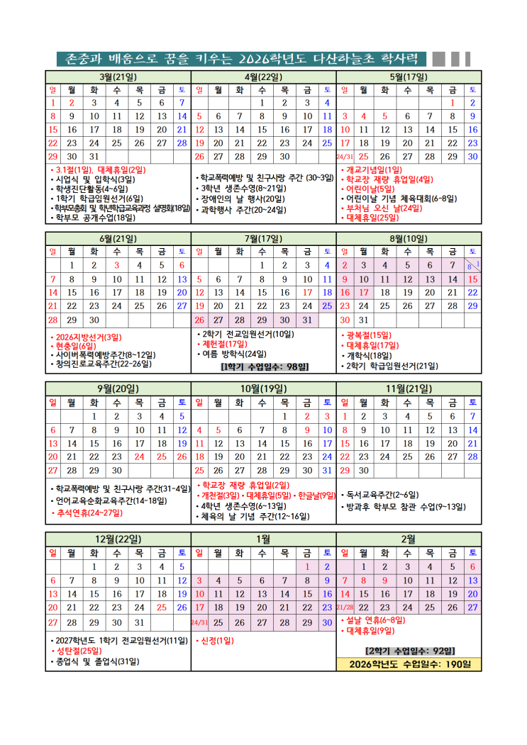 2026 다산하늘초 학사일정 및 시정표