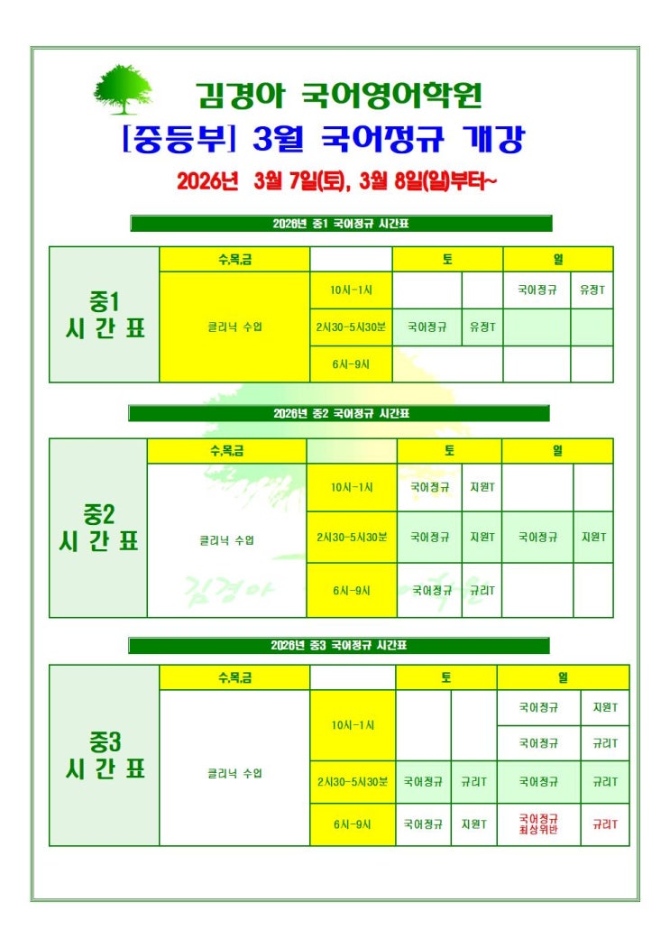 중1 3월 국어정규 수강신청 중2 3월 국어정규 수강신청 중3 3월 국어정규 수강신청 중3 3월 최상위반 수강신청 ※ 내신대비 수업일정에 따라 일정은 변경 될 수 있음 *중1 주차별 수업계획 *중2 주차별 수업계획 *중3 주차별 수업계획 *중3 최상위반 주차별 수업계획 <img src="https://blogthumb.pstatic.net/MjAyNjAyMjZfMTMy/MDAxNzcyMDg0OTQ1NzY3.M87T8G7X2NUbP0JsVWEzE1f_DqtgeIL_Z3F7cmTZ8EAg.-tLHUfm9co9CmPluJIGX59Ic4KNSANg7uFFs97FPOfMg.JPEG/2026%B3%E2_3%BF%F9_%B1%B9%BE%EE%C1%A4%B1%D4_%BE%C8%B3%BB%B9%AE%28%C1%DF%B5%EE%BA%CE%29001.jpg?type=s3" />