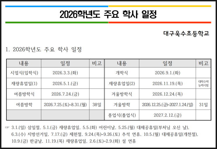안녕하세요. 삼성영어 욱수어학원입니다 :) 오늘은 가까이 있는 대구욱수초등학교의 2026년 학사일정에 대한 안내를 가지고 왔습니다. 학사 일정은 매년 신학기에 학교 홈페이지나 학교알리미 사이트에서 누구나 확인하실 수 있는데, 막상 찾으려 하면 잘 못 찾겠고, 봐도 봐도 기억이 잊어버리는 거 같아요. 그래서 저희 블로그에서도 편하게 금방 확인이 가능하시도록 정리를 해보았습니다. *2026.03.19에 학교 홈페이지에서 확인한 내용입니다. 학교 사정에 따라 일정이 변경될 수 있습니다. 2026년 주요 학사일정 [주요 행사] 3.3(화) : 시업식(입학식) 7.24(금) : 여름방학식 7.25(토)~8.31(월) : 여름방학(38일) 9.1(화) : 개학식....... <img src="https://blogthumb.pstatic.net/MjAyNjAzMTlfMjMx/MDAxNzczOTA5NTQzODE0.02NSt8DfJ5Msk64xf3IaW6UbIRcrmWTwO4o-FgL4EOkg.-giOJ5tMoIHWTKZagcXWVrKfpeaW4DKNuXwlGwkIzKog.PNG/image.png?type=s3" />