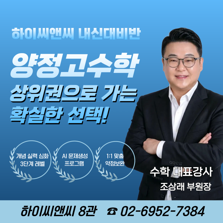 까다롭기로 유명한 양정고등학교 수학 내신, 어떻게 준비하고 계신가요? 양정고는 단순한 문제 풀이를 넘어 깊이 있는 사고력과 시간 배분 능력을 요구하기 때문에, 학교의 출제 경향을 완벽히 꿰뚫고 있는 전문가와 함께하는 것이 무엇보다 중요합니다. 오늘은 하이씨앤씨8관 조상래 부원장님이 제안하는 **[양정고 수학 내신대비반]**만의 필승 전략을 소개해 드립니다! 1. 양정고수학, 왜 하이씨앤씨인가? ✅ 양정고 역대 기출 데이터 완벽 분석 양정고 수학은 변별력을 위한 고난도 문항(킬러 문항)이 반드시 출제됩니다. 저희는 지난 수년간의 양정고 기출 문제를 정밀 분석하여, 자주 출제되는 유형과 변형 패턴을 공식화했습니다. ✅ ....... <img src="https://blogthumb.pstatic.net/MjAyNjAzMjBfMTU1/MDAxNzczOTk3MTk0MDcx.-EKlNb_7XVDjkdNSyQ6E7H3qdOxXChmYgRO9qrMfpR0g.xDLKWHdnNmM5kGVRlgteH1Q7imh5mXN-o_kRnzCqgk0g.PNG/%C1%B6%BB%F3%B7%A1%BA%CE%BF%F8%C0%E5_%281%29.png?type=s3" />
