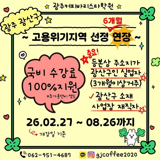 안녕하세요. 광주커피바리스타학원입니다. 작년 8월 28일부터 시작된 광주 광산구 고용위기 선제대응지역 지정이 올해 2월 27일로 끝날 예정이었으나 6개월 연장되었습니다. ⭐26.02.27 ~ 08.26 까지 (※국비훈련과정의 경우 개강일 기준) 따라서, 광주 광산구에 거주하고 있는 실업자분들과 광산구 소재 사업장에 재직중인 재직자분들은 국비훈련과정 참여시 수강료를 전액무료 지원받습니다. (※추가훈련비는 별도) ◼실업자의 경우: ✅등본상 주소지가 광산구 ✅3개월 이상 거주 확인 ◼재직자의 경우: ✅사업장 소재지가 광산구(타지역 거주자 가능) ✅등본상 주소지가 광산구(타지역 사업장 소재지 재직자) ◼자영업자의 경우: ✅부동산....... <img src="https://blogthumb.pstatic.net/MjAyNjAyMjNfMTcw/MDAxNzcxODE1Njg3MjQx.Qf0tMvwP3EoOpjDH3g0OrwmaEwEB7CB10wQCWwzmo_kg.FPi2qvuKWJ12pzbce9WvJuC7-3ag8Ra77elpjBd1s90g.JPEG/%B0%ED%BF%EB%C0%A7%B1%E2%C1%F6%BF%AA%BF%AC%C0%E5.jpg?type=s3" />