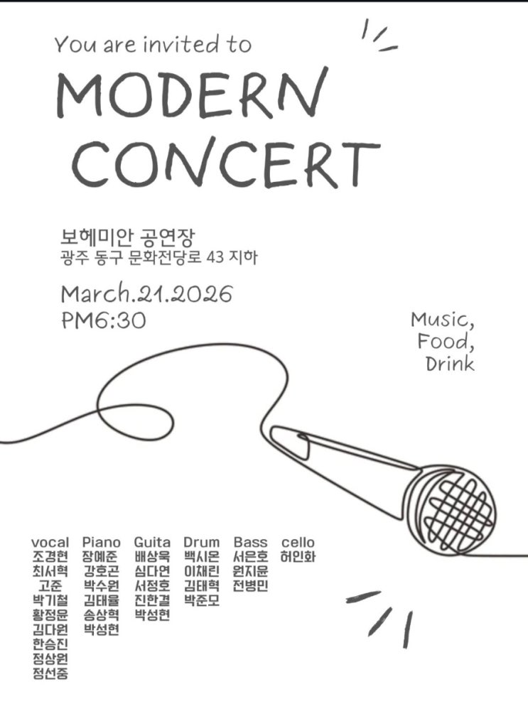 모던실용음악학원 정기 공연 무대 위에서 완성되는 연습의 시간. 보컬, 기타, 피아노, 밴드까지 모던실용음악학원 수강생들이 준비한 진짜 ‘지금’의 음악을 들려드립니다. 서툴지만 솔직하고, 완벽하진 않지만 진심인 무대. 음악을 좋아하는 모든 분들을 초대합니다. 일시 / 장소: 3/21 토 PM 6:30/ 보헤미안 공연장/동구 문화전당로 43 주최: 모던 실용음악학원 <img src="https://blogthumb.pstatic.net/MjAyNjAyMjNfMjA1/MDAxNzcxODU4NzMzOTg3.ahnuC_6RGAoRDV7QT60wY9c0tcLyxmn-fOQ6sWSke0sg.f7C-9fwFaB0fKZ1IVi-S7hoXO14K6jsfbyArini-Prwg.JPEG/900%A3%DFScreenshot%A3%DF20260223%A3%DF235258%A3%DFInstagram.jpg?type=s3" />