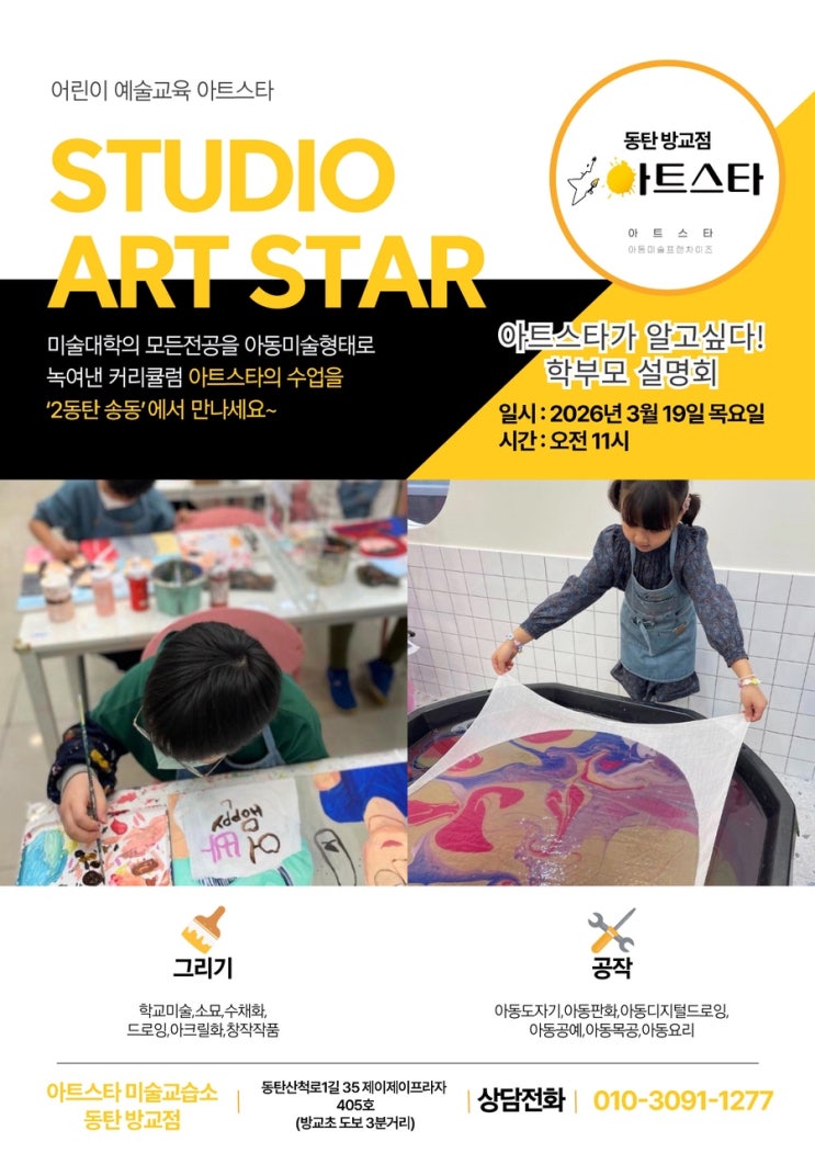 안녕하세요. 아트스타 미술 동탄방교점 입니다. 아이 미술학원을 고민 중이신 부모님들을 위해 아트스타 미술 **수업 설명회**를 진행합니다. 아트스타에서는 단순한 만들기 수업이 아니라 아이들이 스스로 생각하고 표현하는 **창의력·사고력 중심 미술 프로그램**으로 수업이 진행됩니다. 이번 설명회에서는 ✔ 아트스타 미술 수업 방식 ✔ 연령별 커리큘럼 ✔ 아이들의 표현력과 드로잉 실력을 키우는 방법 등을 편하게 설명드릴 예정입니다. 미술학원을 알아보는 부모님들께 도움이 될 수 있는 자리이니 부담 없이 편하게 오셔서 들어보셔도 좋습니다. 또한 설명회에 참석하시는 분들께는 **수강료 혜택**도 준비되어 있습니다. ?....... <img src="https://blogthumb.pstatic.net/MjAyNjAzMTZfMTYx/MDAxNzczNjcyNjk1MTEx.ffJobPnQAwdaCVnV2cOVLcvbcSTk75nwXiuNnqogONsg.u4UWOS-2XUByEH--iqUq3wFi-FV1CnLFE1AScPNUFfQg.JPEG/IMG%A3%DF7469.JPG?type=s3" />