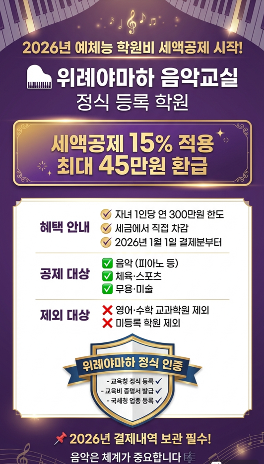 2026년부터 예체능 학원비 세액공제 기준이 적용되면서 학부모님들께 꼭 필요한 정보가 있어 안내드립니다. 위례에서 피아노, 음악학원을 찾고 계신다면 위례야마하, 위례피아노, 위례음악학원 검색하시는 분들께 도움이 되는 내용이에요 ✅ 2026년 1월 1일 결제분부터 적용 2026년 1월 1일 이후 결제한 예체능 학원비 연말정산 시 교육비 세액공제 15% 자녀 1인당 연 300만원 한도 세금에서 직접 차감되는 구조 (세액공제) 즉, 최대 45만원까지 환급 가능 공제 가능한 예체능 프로그램 체육 · 스포츠 음악 (피아노, 바이올린 등) 무용 미술 ❌ 공제 제외 영어 · 수학 등 교과 학원비 동네 과외 미등록 학원 체육시설이지만 학원....... <img src="https://blogthumb.pstatic.net/MjAyNjAyMjBfMjE3/MDAxNzcxNTY4NDk0OTIx.mS-e2BbdrIj_pF1TVk7h9DpsIjUrsPy7MUG_Kr3Atk4g.KFOA5ese39yLkQt4vb0UGrd6BVk6KMH3EmDwdJK0XKog.PNG/IMG%A3%DF9469.PNG?type=s3" />