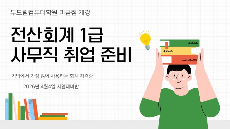 안녕하세요! 두드림컴퓨터학원 미금점입니다. 오늘은 중소기업 사무직종에서 우대사항이 전산회계1급에 대해서 알아보도록 해요~ 2026년 한국세무사회 자격시험일정안내입니다! 시험이 매주/상시 시험이 아니여서, 시험일정을 확인 하셔야 합니다. 대기업은 업무가 세분화되어 있지만, 중소기업의 경우 사무직 직원이 다양한 업무를 함께 담당하는 경우가 많습니다. 예를 들어 -매출,매입 자료관리 -거래 내역 정리 -세금계산서 관리 -간단한 회계 자료 정리 이처럼 기본적인 회계업무가 포함되는 경우가 많기 때문에 전산회계 자격증이 취업에 도움이 되는 경우가 많습니다 회계 실무에서는 엑셀활용이 많습니다. 실제 기업의 회계 업무에서는 엑....... <img src="https://blogthumb.pstatic.net/MjAyNjAzMDZfMTQz/MDAxNzcyNzgyOTI1OTcy.75mwebKyburiJRY6FHDDt06_W8h8lzQm6_bmJMQBeb4g.btr4n8w4BuGIi5-fVwLreXcDDkYKRQkAfjpppKc2E-8g.JPEG/1.jpg?type=s3" />