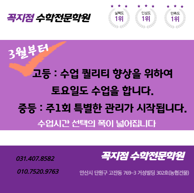 안녕하세요! 단 한 명의 들러리도 없는 수학 학원, 고잔동 꼭지점수학입니다. 일대일 과외식 수업이라는 특장점 때문에, 이번 겨울방학에도 학생들의 문의가 상당히 많았습니다. 과외식 수업에서는 한 class에 많은 인원이 수강하게 되면 그만큼 수업이 어려워지고 허술해 질 수밖에 없다는 한계가 있습니다. 겨울방학 동안 많은 학생들이 꼭지점수학과 함께 공부하게 되어 주중 수업만으로는 높은 퀄리티의 수업을 할 수가 없기에 3월부터 중/고등부 학생들의 수업이 다음과 같이 변경됩니다. (1) 고등부 기존에 없던 토요일에 강의를 새로 개설합니다. 토요일 오전 11시, 오후 1시 2개의 class가 개설되며, 주중과 토요일을 활용하여 다른과목....... <img src="https://blogthumb.pstatic.net/MjAyNjAyMTVfNzQg/MDAxNzcxMTUyNTY0OTgy.O-H-KAxa0h-QToU3KxGBMMapIqhXdEi5S-8umB5Hh3cg.3HpWf4c7oqDlkOkja4PB28r5hBsfqrBpAhk_0UldQSwg.PNG/%BD%C3%B0%A3%BA%AF%B0%E6_%C5%B8%C0%CC%C6%B2.PNG?type=s3" />