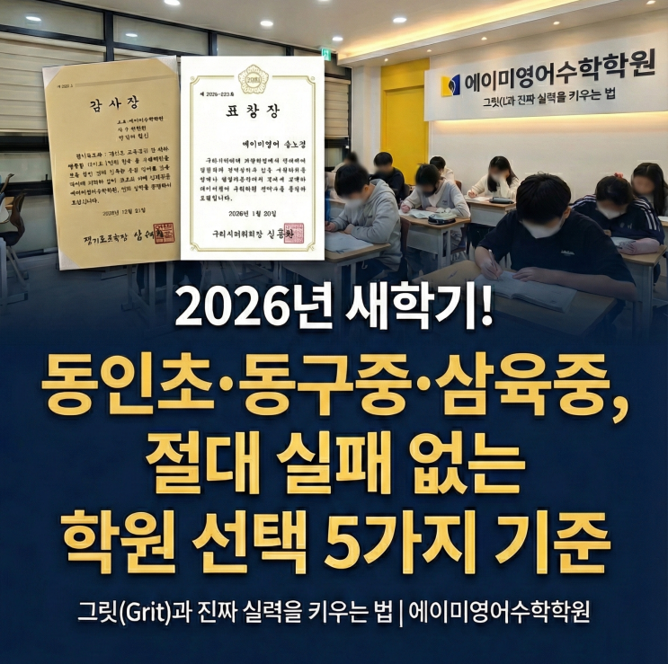 안녕하세요. 학생들의 진짜 실력을 키워내는 곳, '에이미영어수학학원' 원장입니다. 동인초등학교, 삼육중학교, 동구중학교 2026년 새학기가 코앞으로 다가왔습니다. 학년이 올라갈수록 어려워지는 교과 과정에 우리 아이가 잘 적응할 수 있을지, 학부모님들의 고민이 가장 깊어지는 시기입니다. 맘카페를 뒤적이고 주변 지인들에게 물어보며 인창동동 학원들을 알아보고 계실 텐데요. "유명한 프랜차이즈니까", "인테리어가 깔끔해서", "친구가 다닌다고 해서" 학원을 선택하고 계시지는 않나요? 수많은 아이들을 지도해 온 교육자로서, 그리고 교육청과 의회에서도 현장의 목소리를 내고 있는 원장으....... <img src="https://blogthumb.pstatic.net/MjAyNjAyMjFfMTI2/MDAxNzcxNjcyNzMzNzQz.ajofZQEyUVIwNo7Vgc98Pn3udXtVFrHyWgg-gtJyNLgg.noKVZ8lpw12qJU3bui418ZAryRYy7goJhrIFJ62OPZUg.PNG/%BF%A1%C0%CC%B9%CC_%BB%F5%C7%D0%B1%E2_%C7%D0%BF%F8%B0%ED%B8%A3%B4%C2%B9%FD.PNG?type=s3" />
