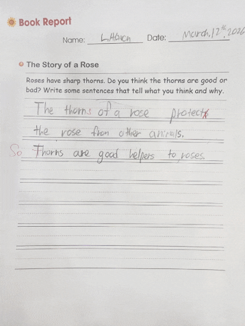 수요일 3:30 목요일 3:00에 있는 Miss Betty's Class에서 아이들이 short writing을 시작했습니다. 책을 읽고 문제 풀이를 하고 글쓰기를 합니다. 충분히 책을 읽고 이해하였기에 스스로의 문장을 만들러 글을 쑬 수 있습니다. New Grammar Time 1,2,3을 끝낸 우리 친구들은 더욱더 완성된 문장을 만들 수 있습니다. 같은 책을 읽었지만 글쓰기는 본인만의 색깔이 보입니다. 다음 주 원서는 Ann Sullivan 을 읽을 예정입니다. Who is Ann Sullivan? Do you know who she is ? 아이들은 매주 다양한 장르의 원서를 읽으며 영어 실력을 쌓아갑니다. Join Us Now !!!!!! 생각을 키우는 영어도서관> YBM 잉글루 신갈 캠퍼스 용인시 기흥구 새....... <img src="https://blogthumb.pstatic.net/MjAyNjAzMTJfMjM1/MDAxNzczMzA3Mjk4MDU4.vO7_e0kVhn-31CFS7D7rPUzzs5peQwfWTBkMHBYEUJYg.exfPR77ypDx1oHqZCHxLobFyMQ-PuqMdjGgKzHkdvdIg.GIF/20260312%A3%DF165708.gif?type=s3" />