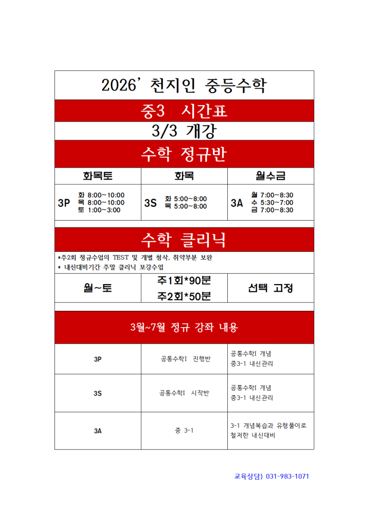 기준 시간표입니다. 우리 학생의 시간표 확정은 상담을 통해 학습상황에 따라 학교/성적/취약부분을 고려하여 설정합니다. 천지인학원은 소그룹강의(10명이내)+개별 클리닉 수업으로 성적을 안정적으로 향상시키는 학원입니다. 중3 1학기 정규 시간표 수학 영어 국어 1:1 개별진도반 1학기 천지인학원과 함께 https://blog.naver.com/chunjiin1071/223953982853 <img src="https://blogthumb.pstatic.net/MjAyNjAyMjFfMjUy/MDAxNzcxNjQ2MDQyOTcz.uvW21oBZEVyRjZf25asgbWb_ZsIofOkNnVVLVqJIkWUg.dhjbDfGfdX9BNVqx9H1XKmGT2XF8nyfXWD4qDIyM3qAg.PNG/%C1%DF3%BC%F6%C7%D0.png?type=s3" />