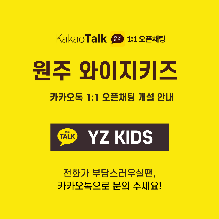 안녕하세요^^ 카카오톡 1:1 오픈채팅 개설 안내 안녕하세요 원주 영어유치부·초등부 전문 YZ Kids Academy (와이지키즈) 입니다. 학부모님들과 더 빠르고 편하게 소통하기 위해 카카오톡 1:1 오픈채팅을 새롭게 개설하였습니다! "YZ KIDS" 를 검색해보세요! ⸻ 왜 1:1 오픈채팅인가요? 기존 단톡방이나 전화 상담이 부담스러우셨던 분들을 위해 개인별 맞춤 상담이 가능한 1:1 오픈챗을 준비했습니다. ✔ 수업 및 커리큘럼 문의 ✔ 연령별 프로그램 상담 ✔ 입학·체험수업 문의 ✔ 학원 생활 관련 궁금한 점 ✔ 기타 편하게 물어보고 싶은 내용 전화번호 노출 없이, 이름 공개 없이 편하게 문의하실 수 있어....... <img src="https://blogthumb.pstatic.net/MjAyNTEyMjJfMTQg/MDAxNzY2MzcwMDE0NDc3.fiDLj1nvNK3nKoUl2RVvGJzl5XSRKkm9Q7M8A6jqnFwg.ve-JB4CchM-ZG8702vqLWzBLRi0WiUXLBl-BUn5ICJYg.PNG/%C1%A6%B8%F1%C0%BB_%C0%D4%B7%C2%C7%D8%C1%D6%BC%BC%BF%E4_%281%29.png?type=s3" />