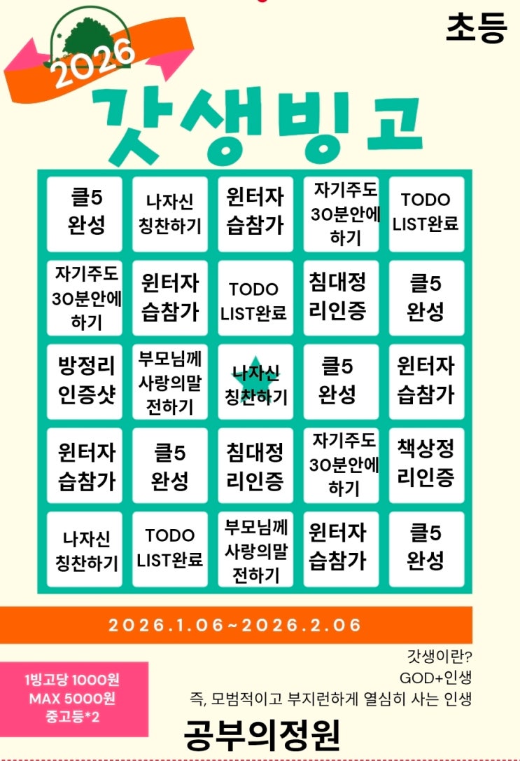 안녕하세요^^ 베스킨라빈스 올리브영이 입점해있는 바젤나인건물 5층에 위치한 공부의정원입니다. 명절 잘 보내셨지요? 명절 지나고 나면 괜히 마음이 다시 리셋되는 느낌… 저만 그런 거 아니죠? 2026년 1월부터 공부의정원에서는 “갓생빙고” 를 진행했어요. 갓생이란? God+ 인생 모범적이고 부지런하고 나 자신에게 부끄럽지 않게 사는 인생 사실… 어른도 쉽지 않죠… 저도 매일 도전 중입니다. 실패는 하지만 매일 도전해요^^;;;; 다.이.어.트요^^ 새해 시작하면서 아이들에게 동기부여를 팍! 주고 싶어서 조금 현실적인(?) 이벤트도 걸었습니다. ✔ 빙고 한 줄 = 1000원 ✔ 대신 MAX 5000원 상한가 (주변 분들께서는....... <img src="https://blogthumb.pstatic.net/MjAyNjAyMjBfMjY5/MDAxNzcxNTY5NjQ3Nzgx.dgwY2CXL4kWRBVigAWomGBv2l9AfGo3tT5Yt5lPw9Ogg.IDcG2QZkecBj1F1utYFg70I2Mky4Y6X70GjDHkICjSYg.JPEG/%B0%AB%BB%FD%BA%F9%B0%ED1.jpg?type=s3" />