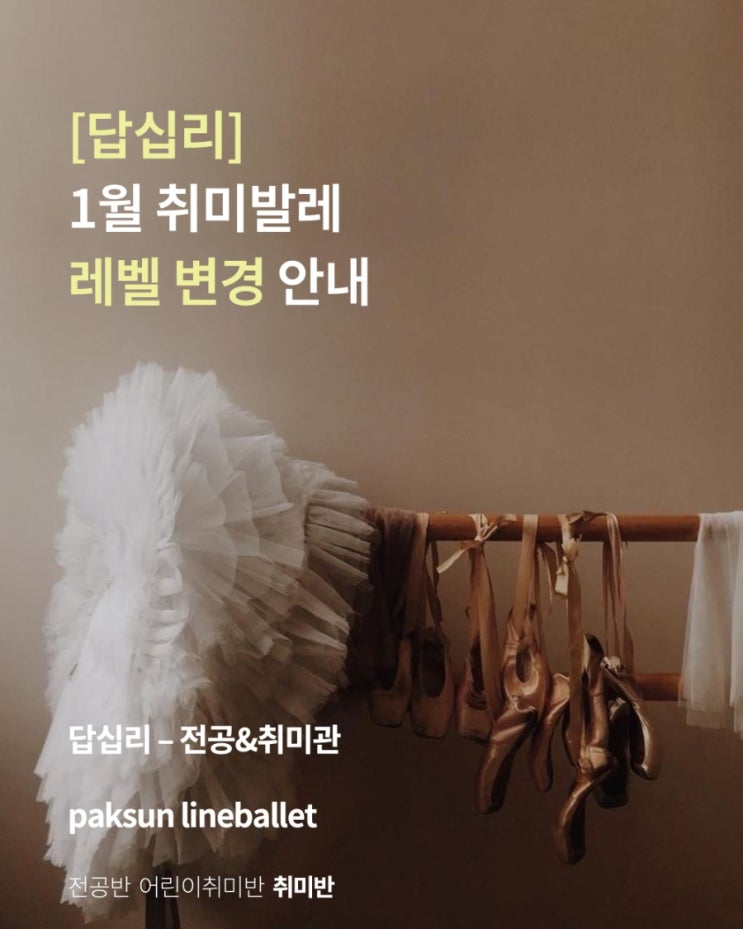 [답십리] 1월 취미발레 레벨 변경 안내 화목 레벨1(p.m. 7:00)반이 마감이 임박하여 부득이하게 그 뒷반인 레벨 1.5 반을 당분간 레벨1반으로 진행하고자 합니다. 조기 마감이 예상되오니 서둘러 문의주시기 바랍니다 변경사항 (화목 p.m. 8:20~9:30) ▪︎변경 전 레벨 1.5 -> 변경 후 레벨 1 ▪︎정원 7명 ▪︎수업료 월 16만원 문의 • 인스타그램(@lineballet_paksun) dm • 카카오톡채널 “박선라인발레학원” • 02)2214-7773 ▪︎카카오톡채널 ▪︎인스타그램 ▪︎[답십리]박선라인발레학원 위치 <img src="https://blogthumb.pstatic.net/MjAyNTEyMTlfMTI2/MDAxNzY2MTMzODU2NTYz.cYREvy58oGdFoh_ITmuvLJiBEMewtz-PH6pDMgzwW0Yg.ZSYPVeAjTfJtL-AYPZ1qptedeKxdN6jVeBwPpmlM-Fwg.JPEG/900%A3%DF1766133228028.jpg?type=s3" />