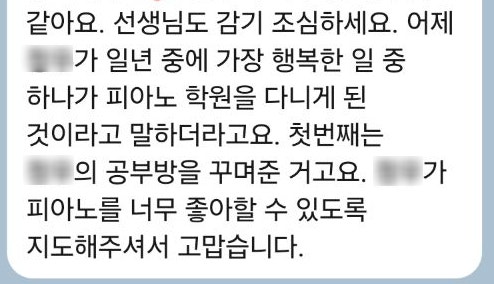 안녕하세요, 포레음악교습소입니다. 얼마 전 제 마음을 뭉클하게 만든 학부모님의 카톡 메시지를 공유해 보려 합니다. "아이가 요즘 가장 행복한 일 중 하나가 피아노 학원을 다니게 된 것이래요. 집에서도 스스로 유튜브 강의를 찾아봐요!" 선생님으로서 이보다 더 보람찰 수가 있을까요? 가슴이 너무 따뜻해지는 카톡이었습니다. 우리 친구는 어떻게 피아노에 흥미를 갖게 되었을까요? 음악에 대한 '흥미'는 너무너무 중요합니다. 평생 함께하는 취미로 갈 수 있는 첫 단추니까요. 저희 포레음악교습소는 단순히 진도만 나가지 않습니다. 원장 선생님이 직접 만든 피아노 교구 : 원리부터 재미있게 깨우칩니다. 1:1 맞춤형....... <img src="https://blogthumb.pstatic.net/MjAyNjAzMjJfMTcy/MDAxNzc0MTc5NjgwNDg4.8iDyhqeyvcHkNkvjBHY45ZMyMfytySntgiWShxoadPQg.6wLV5rvuWaxVlyiVQA3UHO6AK_p2b0ZGmbSlNiKWUCsg.JPEG/1.jpg?type=s3" />