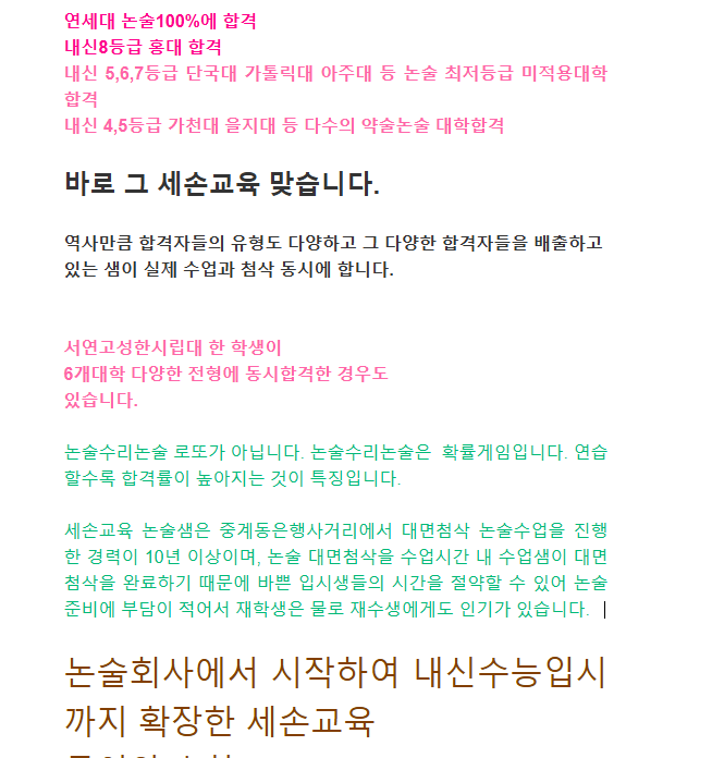 세손교육 과정 설명 블로그입니다. 중등독서https://blog.naver.com/jjd6225/222896138102 고등입시논술https://blog.naver.com/jjd6225/222895691326 중고등내신수능국어https://blog.naver.com/jjd6225/222596397587 고등내신수능수학 https://blog.naver.com/jjd6225/222895882874 상담 전화는 02.939.8088 3월 개학과 더불어 각 학교에서 입시 상담을 하고 논술은 인원이 많이몰리니 약술해라 내신 2~3등급으로도 인서울이 힘들 수 있으니 논술을 해라 또 어떤 선생님들은 논술 경쟁률이 높으니 내신 전형에 집중하여 준비해라 등등 동일한 내신 등급이지만 선생님들의 추천은 선생님들의 입시 경력에 따라 다양합니다. 학교에서 준비할 수 있....... <img src="https://blogthumb.pstatic.net/MjAyNjAzMjRfMjEw/MDAxNzc0MzQyNDEwMzE2.4I5A8uQogvmZdy9dFu2_lraPXWmdAlgBAWtCmDBOWqEg.SbqtVBY0baPc8Qu10PfPj8Z8bwBYvIHFJyehAT-51DQg.PNG/25.12.9.%BC%BC%BC%D5%B1%B3%C0%B0%C7%D5%B0%DD%C0%DA.png?type=s3" />