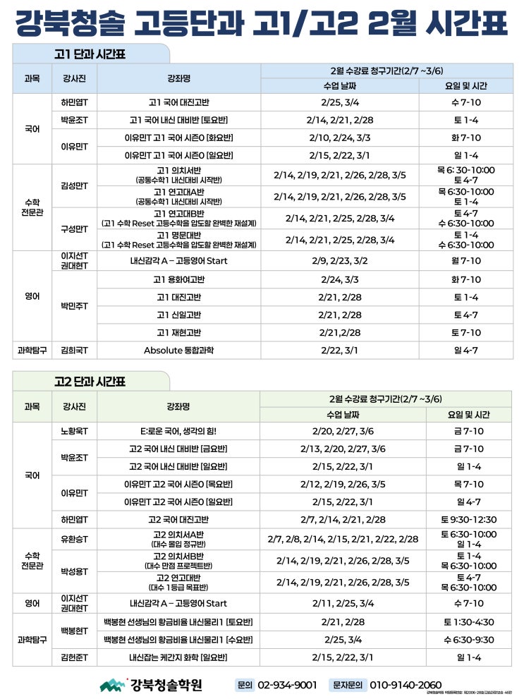 3월 새학기 시작 전 강북청솔학원 2월 단과로 워밍업하기! 강북청솔학원은 국어, 수학, 영어, 과학탐구, 논술 단과를 진행하고 있습니다. 2월 고등단과 시간표를 한눈에 보실 수 있게 정리해 보았습니다~ ▶ 고등단과 선생님 확인하기 ◀ <img src="https://blogthumb.pstatic.net/MjAyNjAyMTVfMjMx/MDAxNzcxMTMyNjQ1NDE5.X_ZDRgzlO3Jlw7KVBusQbN5P25RjlUF-zGERyRTvPIgg.oBkedWyGtQrsV20kG2lONsQhYSbPRfSj_kdDLwm-3g4g.JPEG/%BD%BD%B6%F3%C0%CC%B5%E51.JPG?type=s3" />