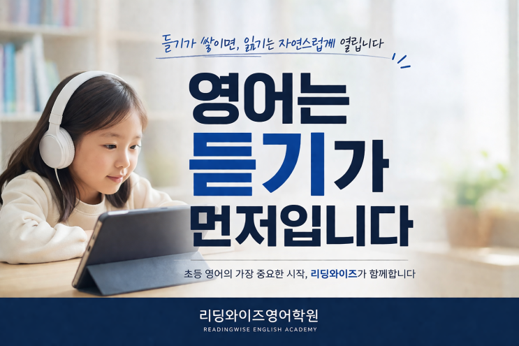 안녕하세요. 리딩와이즈영어학원 김은정 원장입니다. 최근 수업을 하면서 한 가지 고민이 생겼습니다. 이번 달부터 단어 쓰기 숙제를 시작했더니 기존에 꾸준히 잘 해오던 영상 보기(듣기) 숙제가 흔들리는 모습이 보였습니다. 이 장면을 보며 다시 한 번 중요한 질문을 떠올리게 되었습니다. 지금, 아이들에게 더 중요한 영어는 무엇일까. 영어를 ‘언어로 배우는 방법’은 하나입니다 영어를 공부로 배우는 방법은 많습니다. 단어를 외우고, 문법을 익히고, 문제를 풀며 실력을 쌓을 수도 있습니다. 하지만 영어를 ‘언어로’ 습득하는 방법은 사실 하나입니다. 듣는 것입니다. 왜 영상보기가 중요한가요 아이들은 눈으로 배우기 전에 귀로 먼....... <img src="https://blogthumb.pstatic.net/MjAyNjA0MjVfNjAg/MDAxNzc3MDY3MjQ1MTc3.3kEU-0y1eyQ_n0ys1B-c7pVNYjI8XUtdm8rYaNOIspYg.BTXPp-BueR7RAjbk0jekOehIsUdC0gruttgzi4bB5gUg.PNG/ChatGPT_Image_2026%B3%E2_4%BF%F9_25%C0%CF_%BF%C0%C0%FC_06_32_50.png?type=s3" />
