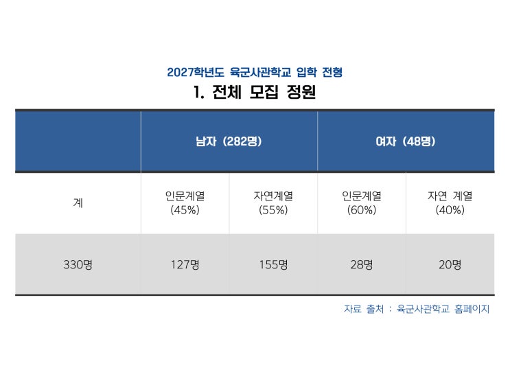 안녕하세요. 은평구영어학원 전문호영어학원입니다. 올해 고등학교 3학년 학생들에게 해당되는 2027학년도 육군 사관학교 입학 전형 자료를 가지고 왔습니다. 사관학교 진학에 관심 있는 학생들에게 조금이나마 도움이 되었으면 합니다. 육군사관학교와 관련한 더 다양한 정보를 원하시면 아래 링크된 홈페이지를 확인하시면 됩니다. ↓↓↓↓↓↓↓↓↓↓↓↓↓↓↓↓↓↓ 2027학년도 육군사관학교 입학 정원은 모두 330명입니다. 이 중 남자는 282명, 여자는 48명 모집 예정이라고 합니다. 각각의 성별 정원에서 계열로 다시 나뉩니다. 남자는 인문계열 45%인 127명, 자연계열에서는 55%인 155명을 모집하게 됩니다. 여자는 인문계열 60% 28명....... <img src="https://blogthumb.pstatic.net/MjAyNjA0MjhfMjQz/MDAxNzc3MzAzNDI3NDQ5.aKi2bu_VqTV2mwQvKx5GBaBYrAYkz-UHNNXHfoGfsOAg.t0GNhy58cCF6U7Uly4VkUn6QnFSf2ELeQ6dDlvStMIcg.JPEG/2027%C7%D0%B3%E2%B5%B5_%C0%B0%B1%BA%BB%E7%B0%FC%C7%D0%B1%B3_%C0%D4%C7%D0_%C0%FC%C7%FC_-_001.jpg?type=s3" />