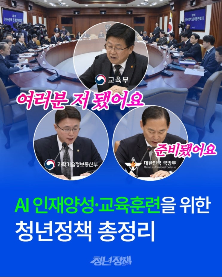 AI 인재양성·교육훈련을 위한 2026년 청년정책 제1차 청년정책 관계장관회의에서 교육부, 과학기술정보통신부, 대한민국 국방부가 AI 인재양성·교육훈련을 위한 청년정책 을 발표했어요. 어떤 청년정책이 준비되어 있을지 지금 바로 확인해 보세요! 교육부 국가장학금, 학자금대출 등 교육부 청년정책 청년들의 역량을 강화해요 ✅지역 거점국립대에 AI 교육체계 신설해 AI 역량 강화 지원 ✅대학·기업이 1년 내 교육 프로그램을 함께 개발해 AI·반도체·바이오 등 첨단분야 실무 역량 강화 ✅직무 관련 온·오프라인 'AI+X' 교육을 제공하여 재직자 AI·디지털 역량 강화 학자금 부담을 줄여요 ✅연간 국가장학금 지원금액을 최....... <img src="https://blogthumb.pstatic.net/MjAyNjAyMjBfMTIx/MDAxNzcxNTY5MDgxOTIz.f0hkfcjunpK4NYGJ7OLcxGzOoWKDPSOm3E9Vw9mMcEIg.cqTTaef8pSlmUNvF4HpqwoMGaj743kRRdcOSM18Suz8g.JPEG/1.jpg?type=s3" />