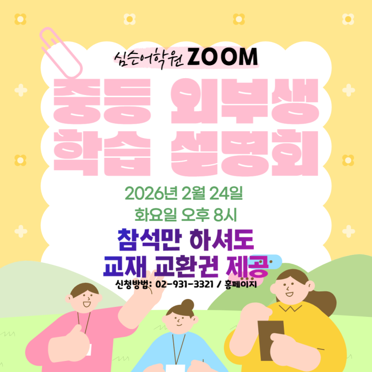 안녕하세요! 은행사거리 중등 영어 심슨어학원 중계 캠퍼스입니다 심슨어학원이 궁금하셨던 학부모님들께 반가운 소식을 전해드립니다. 유난히 추웠던 겨울이 지나고, 아이들의 새로운 시작을 준비하는 봄 학기가 다가오면서 은행사거리 심슨어학원에 관심 있는 중등 외부생 학부모님들을 위한 2026년 2월 온라인 설명회를 준비하게 되었습니다. 이번 설명회는 ZOOM을 통한 온라인 설명회로 진행되며, 심슨어학원만의 체계적인 영어 커리큘럼과 레벨 구성, 그리고 실제 수업은 어떤 방식으로 진행되는지에 대해 보다 구체적이고 자세한 안내를 드릴 예정입니다. 심슨어학원의 정보뿐만 아니라 중등 시기에 어떤 방향으로 영어 학습을 이어가는 것....... <img src="https://blogthumb.pstatic.net/MjAyNjAyMjBfNjkg/MDAxNzcxNTc4MDc4OTQx.LkZI9akEsLmVh9pvCKY2JWfAR7qzcc6RezB_fsH8nIQg.Fd9jTK6ntfdTHk4c8NkDS0VRowwDaKveELCm9bEYR7Mg.PNG/KakaoTalk_20260220_175916718.png?type=s3" />