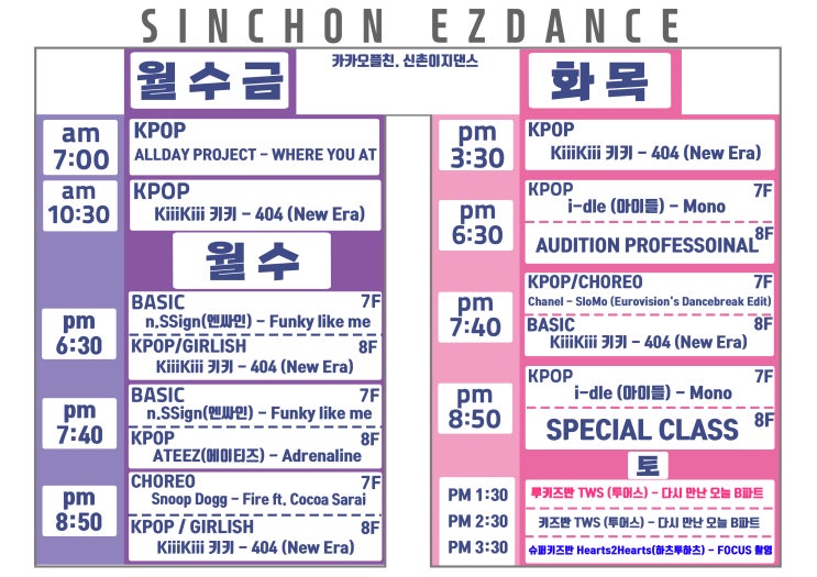 26년 2월 넷째주 수업 곡명 #키키 #404 #방송댄스 배우기 안녕하세요-! #신촌댄스학원 #신촌이지댄스 입니다 =!! 어느덧 날이 풀리고 봄을 맞이하는 듯한 날씨, 다가오는 새학기와 풋풋한 봄내음이 마음을 들뜨게 하는 요즘인데요-! 저희 #이지댄스신촌점 과 함께 신나는 #댄스 로 함께 봄을 만날 준비 해보시는 건 어떠신가요-?! 2월의 마지막 주까지 알찬 수업 곡명으로 준비했습니다! 요즘 누구보다 핫한 키키 #kiiikiii 의 404 ( #NewEra ) 부터 #엔사인 #nssign 의 #funkylikeme , #idle #아이들 의 #mono #모노 , 근본 #케이팝 으로 돌아온 #에이티즈 #ateez 의 #adrenaline #아드레날린 , #올데이프로젝트 #올데프 의 #whereyouat 까....... <img src="https://blogthumb.pstatic.net/MjAyNjAyMjFfNDkg/MDAxNzcxNjQ5ODUyMjky.HXfAwr5enWypanrZO6e9rH3ro6Wj3X4EEUwDYSRQPD4g.CNKVin8jtGqi_O21_x6V7F6t_GTbRaEWDEsJ7stsziwg.JPEG/26%B3%E2-2%BF%F9-%B3%DD%C2%B0%C1%D6-%BC%F6%BE%F7%B0%EE%B8%ED.jpg?type=s3" />