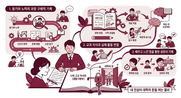 '자기평가서' 혹은 '수행 결과물'의 중요성에 대해 이야기하겠다. 선생님들은 수많은 학생을 지도하기에 네 모든 활동을 세세히 기억하기 어렵다. 자기평가서는 네가 한 학기 동안 노력한 흔적을 선생님의 생활기록부 기록으로 옮길 수 있는 가장 공식적인 통로이다. 1. 결과보다 '동기'와 '노력의 과정'을 구체적으로 적어라 단순히 "실험을 성공적으로 마쳤다"는 기록은 의미가 없다. "교과서의 이론을 실제 사례에 적용해보고 싶어 실험을 설계했고, 중간에 발생한 오차를 해결하기 위해 관련 논문을 찾아보며 수정한 끝에 결론을 도출했다"와 같이 네가 고민한 흔적을 보여주어....... <img src="https://blogthumb.pstatic.net/MjAyNjAzMTRfMjY1/MDAxNzczNDUwODU0MDc5.ZRpdLq4OWnqFlXCx0E2DPyrVv-bjUYhQBLHR98rCSRIg.1sm511mENY8NZJa03u97Z74e0rqms4iweFVVjpBHCVEg.PNG/image.png?type=s3" />