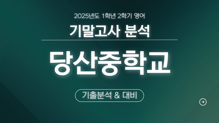 안녕하세요! 페리온영어입니다. 오늘은 25학년도 당산중학교의 1학년 2학기 영어 기말고사 시험을 바탕으로 어떤 유형과 난이도로 출제되었는지 전체적인 분석으로 총평까지 알아보겠습니다! 당산중 2025년도 1학년 2학기 기말고사 분석 ☑️ 점수 배점 ▪️ 선택형 : - 2점 x 4문항 = 8점 - 3점 x 20문항 = 60점 - 4점 x 8문항 = 32점 ☑️ 개별 문항 분석 ▪️ 비상(황) 교과서 6, 7, 8과 (대화문 제외) ▪️ 학교 유인물 ☑️출제 유형 ▪️ 선택형 : · 어법 (20문항) · 내용 이해 (12문항) 유형별 분석 및 특징 (1) 어휘 어휘 문장은 단독 어휘형이라기보다, 어법 문항과 결합된 형태로 출제되었다. 숙어 표현(관용구)(과 문....... <img src="https://blogthumb.pstatic.net/MjAyNjAyMDJfMTY4/MDAxNzY5OTk0OTE4ODc5.Qd-0Eu7VT0lzPzXX6WsQKjR6UAY-h9N07L9ANaQVcYQg.BC6oSccDETvfKusu5iCqN1KUeUTSBy-O-J_LVsJT2PEg.PNG/001.png?type=s3" />