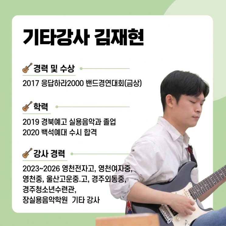 안녕하세요, 장실용음악학원입니다 오늘 소개해드릴 강사님은 기초부터 실전 연주까지 탄탄하게 지도해주시는 기타강사 김재현 선생님입니다 ✔ 경력 및 수상 - 2017 응답하라2000 밴드경연대회 금상 ✔ 학력 - 경북예고 실용음악과 졸업 - 백석예술대학교 수시 합격 ✔ 강의 경력 - 영천전자고, 영천여중, 영천중 - 울산고운중·고 - 現 경주 외동중 - 現 경주청소년수련관 - 現 장실용음악학원 기타강사 김재현 강사님은 단순한 코드 위주의 수업이 아니라 학생의 수준에 맞춰 ✔ 곡 연주 중심 ✔ 실전 적용 중심 ✔ 즐겁게 지속 가능한 수업 을 지향합니다. 기타를 처음 시작하시는 분부터 입시, 공연을 준비하는 분들까지 모두에게....... <img src="https://blogthumb.pstatic.net/MjAyNjA0MjhfMTMy/MDAxNzc3MzY1MTAxODg5.ltdMss4o4ehX7DKGIVdTWpbCN3Laa6goFIckrhMoFuwg.nTRbBAIKrN9tdYMhFjxueDqYzi-ZE_Hlt8M2m0gJHcsg.PNG/hf_20260428_082211_c73b9ad2-e135-457b-97e3-218db7498520.png?type=s3" />