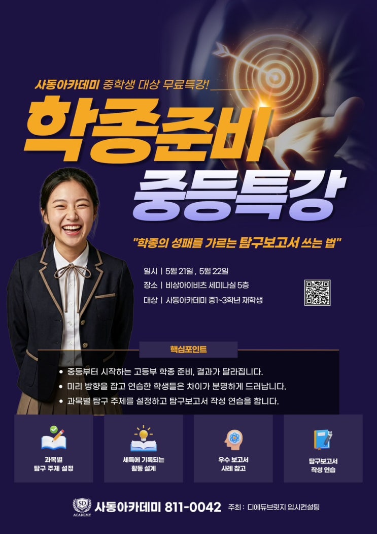 사동아카데미에서 공부와 학종 준비를 함께 준비하자! ✍중학생 탐구보고서 작성 무료특강!