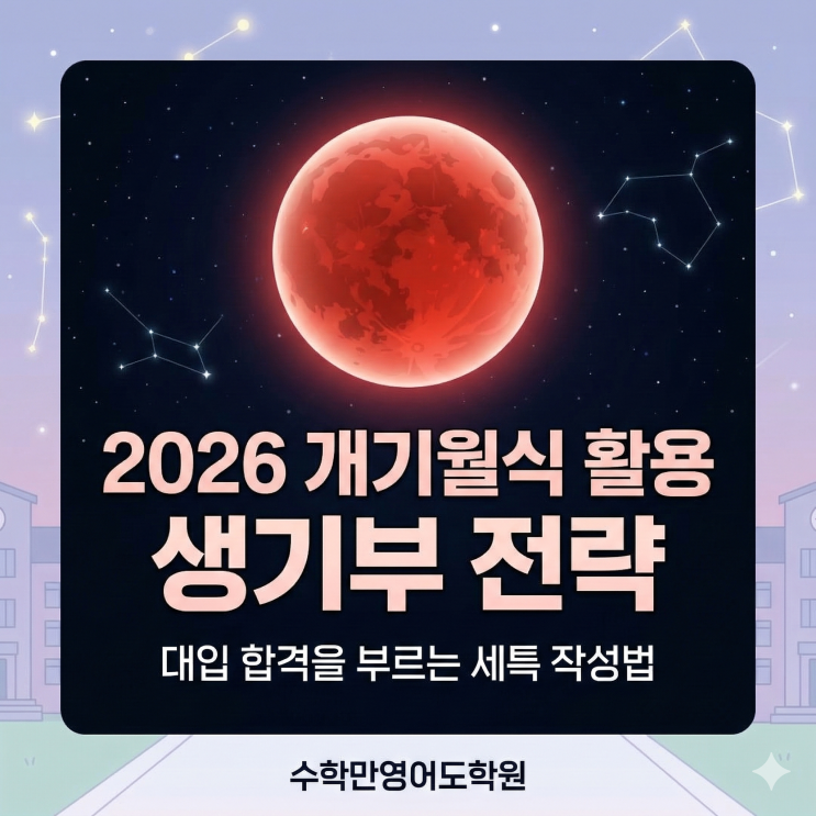 안녕하세요! 경산 하양읍 중·고등 영·수 전문학원, 수학만영어도학원입니다. 지난 3월 3일 정월대보름, 밤하늘에 아주 특별한 우주 쇼가 펼쳐진 것 다들 보셨나요? 바로 달이 지구 그림자에 완전히 가려져 붉게 물드는 '개기월식(블러드문)' 현상이었습니다! 많은 분들이 밤하늘을 보며 신기해하고 소원도 비셨을 텐데요. 하지만 대학 입시를 준비하는 우리 중·고등학생들에게 이 개기월식은 단순한 구경거리로 끝나서는 안 됩니다. 입시생이라면, 이런 특별한 자연 현상을 나의 전공 적합성을 보여줄 완벽한 '생기부 세특(세부능력 및 특기사항)' 소재로 활용해야 합니다! 오늘은 붉은 달 현....... <img src="https://blogthumb.pstatic.net/MjAyNjAzMTBfMjY3/MDAxNzczMTM1OTkyNjE4.M7yTbLaxrMZHrIvV_nSNaf9L4nzjJc4dsWrkflA_42Ag.Mr7kWjiYU-aC76MHu0wxBdhgSS7c_ny-EimuJvuYo5Qg.PNG/Gemini_Generated_Image_tgv7yctgv7yctgv7.png?type=s3" />