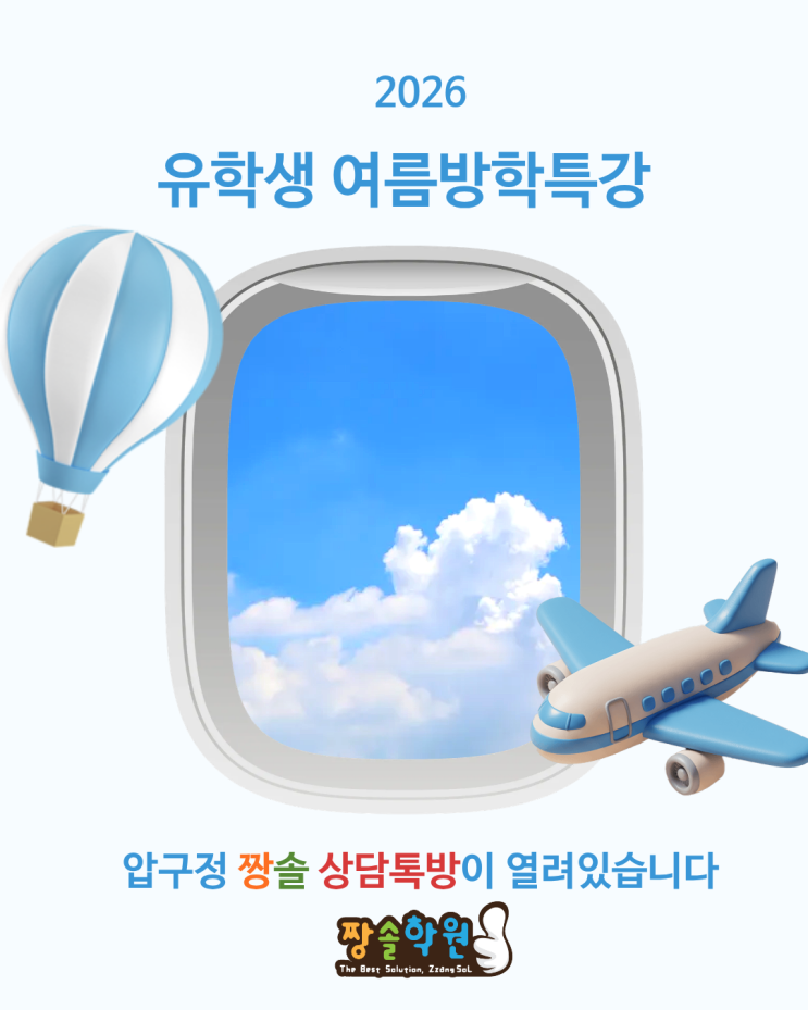 압구정짱솔이 위치한 지역적 특성과 개별맞춤수학의 전문성때문인지 3월이 되면서 꾸준히 여름방학유학생특강에 대한 문의가 있습니다 아무래도 멀리 계시다보니 귀국을 위해서 준비해야 할 게 여러가지시고 정보가 한정되어있다보니 걱정도 많으신 듯합니다 압구정짱솔은 학부모님을 위한 상담톡을 개설해서 운영중입니다 해외에 계셔서 전화통화가 힘드신 경우는 상담톡으로 물어보시거나 상담톡 전화로도 상담이 가능하십니다 올해 유학생 특강이 기대되는 이유는 대치짱솔에서 가장오랫동안 유학생특강을 하신 원장님반과 대치짱솔에서 장기근속하시고 만족도가 높은 선생님반이 개설됩니다 ★상담톡을 원하시면 아래 링크를 클릭해주세요★....... <img src="https://blogthumb.pstatic.net/MjAyNjAzMTNfNTQg/MDAxNzczMzgyNjMwMTQ5.e3ST6wnUgatySOeR6ffdt8Jjpp5I3bmQLpq1hRDfeNsg.GP5csWH5hMrszhRw3cNUVYu3BVA89LGPZlEmYso1NFgg.PNG/%C1%A6%B8%F1%C0%BB_%C0%D4%B7%C2%C7%D8%C1%D6%BC%BC%BF%E4..png?type=s3" />