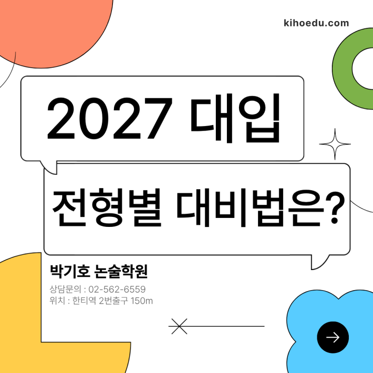 안녕하세요. 박기호 논술학원입니다. 2027학년도 대입은 전체적으로 수시 중심 흐름이 이어집니다. 다만 상위권 대학은 여전히 정시 영향력이 크고, 비수도권 역시 정시 변수까지 함께 고려해야합니다. 수능 일정도 뒤로 밀리면서 전체 입시 일정 관리의 중요성도 커졌습니다. 올해는 특정 전형 하나만 보고 준비하기보다 전체 구조를 함께 보는 시선이 필요합니다. 이번 글에서는 2027 대입 전형벌 대비법을 정리했습니다. 이번 대입에서 주목해야 할 흐름은 전형 간 경계가 점점 흐려지고 있다는 점입니다. 예전처럼 교과전형은 내신만, 학생부종합전형은 비교과만 논술전형은 논술만, 준비할 수 없는 구조입니다. 이제는 어떤 전형을 준비하든....... <img src="https://blogthumb.pstatic.net/MjAyNjAzMTNfNjcg/MDAxNzczNDA0MDU0Nzk3.gcDGPfvJU5GKTIAv9oUpBGo5hXfhn1lroBVop4HQv-Yg.xvY0GrY28-XkyfESsuN7_gT4cL1-FtsQXx9ApmhzcSgg.PNG/%C1%A6%B8%F1%C0%BB_%C0%D4%B7%C2%C7%D8%C1%D6%BC%BC%BF%E4._%2824%29.png?type=s3" />