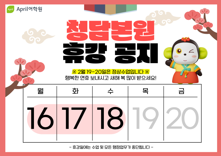 2/16(월)~2/18(수)은 #설 명절 연휴로 수업이 없습니다 행정 및 셔틀버스 등 모든 학원 업무가 중단되오니 참고 부탁드립니다. 귀향길 안전하게 다녀오시고, 가족들과 함께 따뜻한 시간 보내시길 바랍니다 ( ˘ ⌣˘ ) 2/19(목), 20(금)은 정상수업입니다. 건강한 모습으로 다음 주에 만나요! <img src="https://blogthumb.pstatic.net/MjAyNjAyMTFfMjc1/MDAxNzcwODA1Mzk2MzIy.54V38UR-usv1n4irO3q1W-y3D7hLTLNTIcKNF4cQzd0g.fkoGOcXcxFoQG67vSLbFE_OEk5o4loiYwfZIyEPLij8g.PNG/%BC%B3%C8%DE%B0%AD1.png?type=s3" />