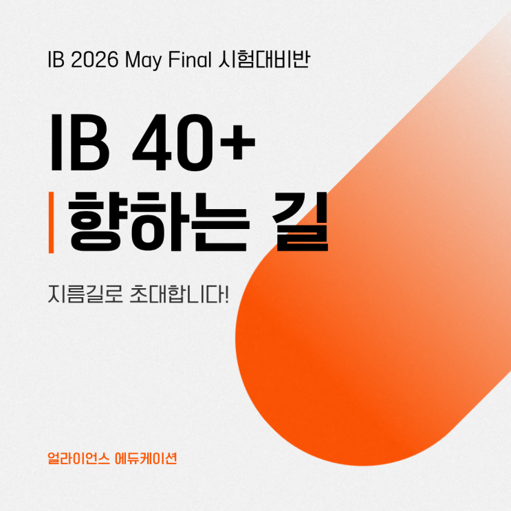 정직하고 제대로 된 학습 경험을 선보이는 IB 전문학원. 얼라이언스 에듀 입니다. "정말 점수 잘 내는" 강사진이 이번 2026년 5월 IB 시험 대비, 확실한 고득점을 위한 강의를 가지고 여러분을 맞이합니다! # 시간표 확인하기 (링크) (중국/인도네시아는 VPN 필요) 링크가 열리지 않을 시 아래 링크 또는 학원 사이트에서 확인 가능합니다! #학원 사이트 공지사항 # 25년 5월 시험, 40점 이상 취득 결과 확인하기!(링크) # 1월 26일 부터 순차 개강 # 과목마다 주 1회 온라인 수업 # 3월 중에 매주 모의고사 진행하여 시험 분위기/긴장감 조성! # 개설 과목: Math AA, English, Science (화학/생물/물리), Social Science (ESS/경제/경....... <img src="https://blogthumb.pstatic.net/MjAyNjAxMThfMjUy/MDAxNzY4NzAyMTMxMDAz.46mjhNpSHtplbSESqzCamwZRqoBFsPyKnxK7AJAY5vAg.w-8p-ODl3bW-L5KxJ1ZWmSU0xnZuUADp0gGyevSy0Pkg.PNG/2026may.png?type=s3" />