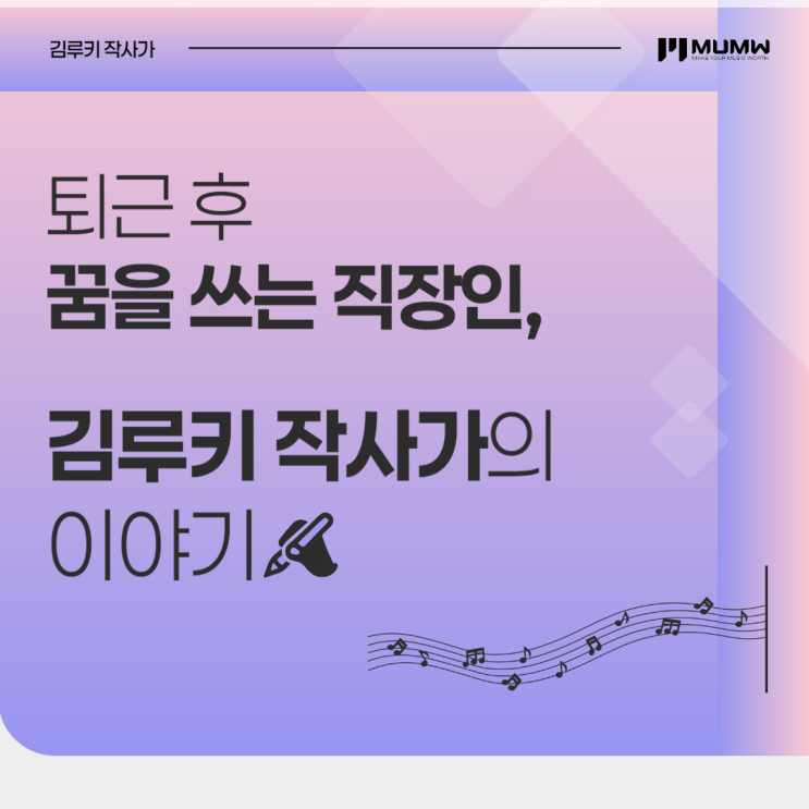 안녕하세요. 200여 명의 신인 작가를 배출한, K-POP 작사가 데뷔에 특화된 교육 기관 MUMW(메이큐마인웍스)입니다. 오늘은 MUMW 수강생 출신, 직장인 김루키 작가님의 인터뷰를 전해드립니다. 평범한 직장인이었지만, MUMW에서 배운 노하우와 실전 경험을 통해 K-POP 가사의 세계에 첫 발을 내디딘 과정과 작사 활동에서 느낀 배움과 성장을 생생하게 전해드리겠습니다! 같은 길을 고민하는 예비 작사가분들에게도 큰 영감이 될 이야기가 될 것입니다. 첫 데뷔의 순간과 대표곡 이야기 김루키 작가님은 낮에는 직장인, 밤에는 작사가로 활동하며, MUMW 아카데미 수업을 통해 실무 감각을 빠르게 익혔습니다. 데뷔 확정 소식을 처음 들었을 때는 식....... <img src="https://blogthumb.pstatic.net/MjAyNjAxMjBfMjIz/MDAxNzY4ODY2MDIzMzk0.sOAjES1cN2K6boStThOzzl-hWJRZUXqM55uU-mpKli4g.axTzzGM9prkG1ePFN9DQe3YVVKc4O9v-3ViajsNROBQg.PNG/%B3%ED%C7%F6%B5%BF_%C0%DB%BB%E7%C7%D0%BF%F8-001_%2811%29.png?type=s3" />