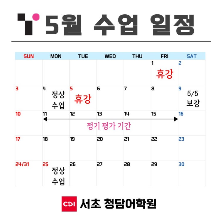 안녕하세요 서초 청담어학원입니다. 5월 수업 일정 안내 도와드리겠습니다. 재원생 여러분께서는 수업 일정 및 휴강일을 반드시 확인해 주시기 바랍니다. 일정 관련 문의사항은 원으로 연락 부탁드리겠습니다. 감사합니다:) <img src="https://blogthumb.pstatic.net/MjAyNjA0MjhfMTg1/MDAxNzc3MzU5ODg3MDky.VglqBQDk7B4g1TFjIzO_0szk3ZM7SVhHHY003IddUZEg._1T-IuAgQxPsN44aCE5MlMeujzm1fH8dpNBQEG00xN0g.JPEG/%C1%A6%B8%F1%C0%BB_%C0%D4%B7%C2%C7%D8%C1%D6%BC%BC%BF%E4.-_%BA%B9%BB%E7%BA%BB.jpg?type=s3" />