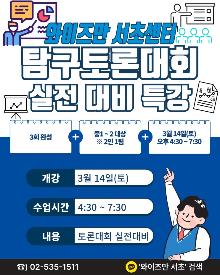 와이즈만 서초센터 2026년 탐구토론대회 실전 대비 특강 개강! 안녕하세요 와이즈만 서초센터입니다^^ 2026년 과학 탐구토론대회를 대비해 실전 특강을 개강합니다! 탐구토론대회는 2인 1팀으로 진행되며 교육청 요강에 따라 학교 / 지역별 예선으로 시작하여 구, 시, 전국 대회로 이어집니다. 특히 올해는 학교 대회와 전국 대회의 대회 방식이 다를 수 있을 것으로 예상되기 때문에 대회를 잘 대비하려면 여러 과학 이슈들에 대한 꼼꼼한 탐색과 개요서 작성 등에 대한 체계적인 학습이 필요합니다. 이번 3월 와이즈만 서초센터의 실전 대비 특강을 통해 대회를 준비하고 학교를 넘어 전국대회까지 좋은 성과를 목표로 정진해보세요! 와이즈만....... <img src="https://blogthumb.pstatic.net/MjAyNjAyMjZfMTU2/MDAxNzcyMDg5MjI5MjAz.FtcYBoX0MnpATnxRR4g7WzlNMsw6IU9nYpF_7TNa3S8g.39rISC5qp-ox-jrlS2t41gxojQi-BGqkZ1y3wrxn0vMg.JPEG/3%BF%F9_%C5%BD%C5%E4%C6%AF%B0%AD_%C6%F7%BD%BA%C5%CD.jpg?type=s3" />