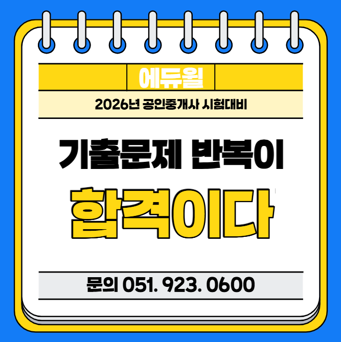 안녕하세요. 에듀윌 공인중개사 부산 서면학원입니다. 공인중개사 시험을 준비하는 수험생이라면 한 번쯤 이런 고민을 해보셨을 것입니다. “이론은 열심히 공부했는데 문제를 풀면 생각보다 어렵다.” “어떤 문제를 중심으로 공부해야 할까?” 이럴 때 가장 중요한 공부가 바로 기출문제 학습입니다. 공인중개사 시험은 매년 새로운 문제가 출제되지만 기출문제를 기반으로 한 출제 패턴이 반복되는 시험이기 때문입니다. 그래서 많은 합격생들이 공통적으로 이야기합니다. “공인중개사는 기출문제를 얼마나 제대로 분석했느냐가 합격을 좌우한다.” 특히 공인중개사 시험 준비에서 이론 학습 이후 문제풀이 단계로 넘어가는 시기에는 기출문....... <img src="https://blogthumb.pstatic.net/MjAyNjAzMTJfNDQg/MDAxNzczMjk3OTM1NzEy.isbfsTrPWNcBfRZi1ixqVZdlVHQEq1zmfRZ3DP0yOQkg.ikPyCQL3Uxe-3Gjl22kKZgbnvtyD-SGigwt3IV6T6tgg.PNG/image.png?type=s3" />