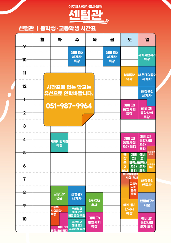 센텀시티 마린시티 사회 역사 학원 - 이도용 사회 한국사 센텀관 2026년 2월 둘째주 일정 안내