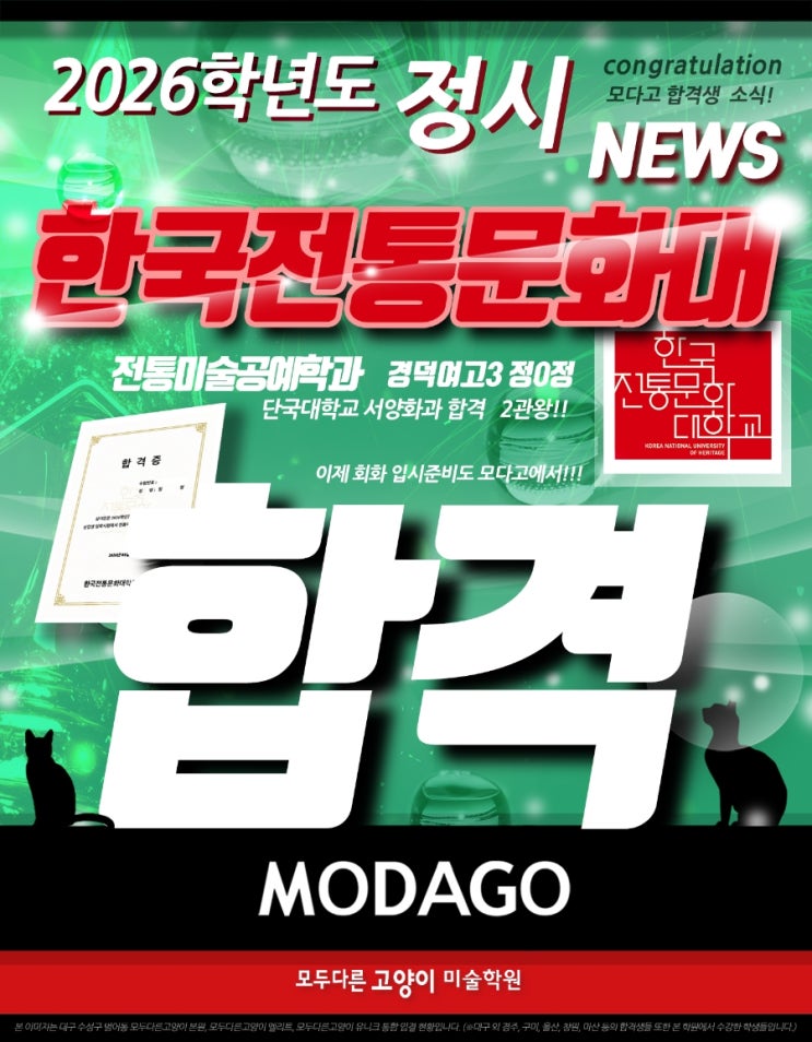 2026 정시 한국전통문화대 합격! 대구 모두다른고양이미술학원(모다고)