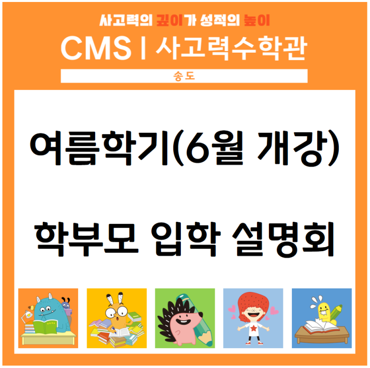 CMS사고력수학관 송도센터에서 여름학기(6월 개강) 입학을 원하시는 학생을 대상으로 학부모 입학설명회를 진행합니다. CMS사고력수학관 Q&A Q1. 입학시험은 언제 보나요? CMS사고력수학관 수업은 1년 4분기로 구성, 분기별 12주 단위로 수업을 진행하며 분기가 개강하는 12월, 3월, 6월, 9월 초에 맞추어 입학할 수 있습니다. 입학 테스트는 매 분기 마지막 달(11월, 2월, 5월, 8월)에 응시할 수 있습니다. Q2. 입학시험 결과는 언제 알 수 있나요? 테스트 종료 후 채점 및 분석 과정을 거친 후 성적표 출력이 완료되면 응시 결과 확인 및 응시 결과를 바탕으로 입학 상담을 받으실 수 있습니다. 입학 상담은 응시 종료 후 바로 연계하여 진....... <img src="https://blogthumb.pstatic.net/MjAyNjA0MjFfMTA2/MDAxNzc2NzU0MDIyOTM2.YMl2q2cd8ckqJI6OCvEHbwCYIuoHQkfyxD-S7a3gihog.XbIGeW8tXOVgGH-phmuMaNvPDDdY_fGtJZSd-f-m1hsg.PNG/%BD%BA%C5%A9%B8%B0%BC%A6_2026-04-21_145242.png?type=s3" />