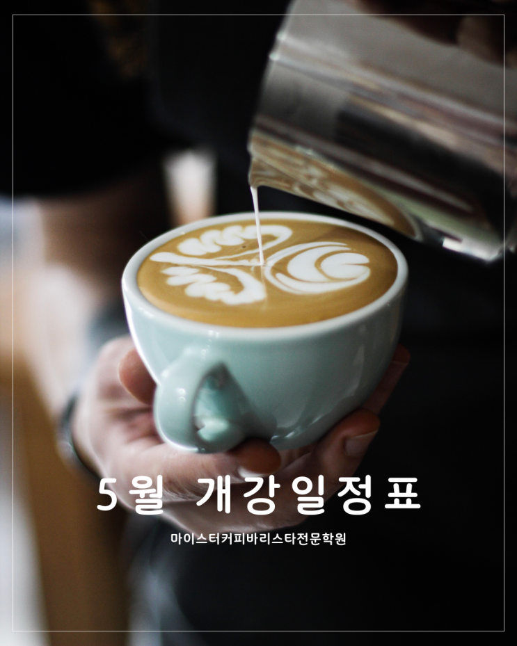 26년 5월 개강 일정표 입니다. 개강 일정표 보시고 궁금하신 사항은 카카오채널 또는 전화 문의 주세요 ♥ 마이스터커피바리스타전문학원은 바리스타 , 브루잉, 로스팅, 카페메뉴 등 기초반부터 고급반까지 다양한 프로그램이 준비되어 있습니다! 마이스터커피바리스타전문학원으로 오셔서 즐겁게 커피도 마시고 수업도 듣고 자격증도 취득해보세요~!! 2023년 한국소비자산업평가 아카데미 부문 우수 (사)한국커피협회 실기고사장, SCA 실기고사장 (사)한국커피협회 실기평가위원직강(선임/일반) (사)한국커피협회 홈카페마스터 최우수상 수업에 관련하여 궁금하신 사항이 있으시면 학원으로 문의주세요 :) 카카오채널 1:1 상담....... <img src="https://blogthumb.pstatic.net/MjAyNjA0MjJfMzUg/MDAxNzc2ODQ0MjgxMjAx.xi__ltEa6_vq3xUB-Dh-yN49OdgPT7UY20N5trLOGtYg.sFh-8ojHuQFiAN11qXuAbycJozml6CbQPSzx5Xp1hckg.PNG/1.png?type=s3" />