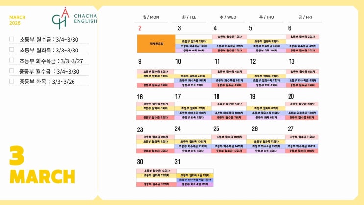 [루원시티 차차영어학원] 3월 수업 스케줄