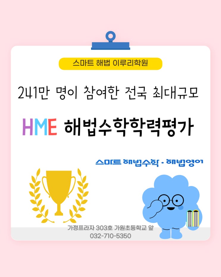 전국 241만 명이 참여한 HME 해법수학 학력평가 안내 안녕하세요 스마트 해법 이루리 학원입니다. 오늘은 학부모님들께서 매년 관심을 많이 가지시는 HME 해법수학 학력평가 소식을 안내드리려고 합니다. HME 해법수학 학력평가란? HME는 전국 단위로 진행되는 대규모 수학 학력 평가로, 무려 241만 명이 참여한 전국 최대 규모 시험입니다. 학교 시험만으로는 확인하기 어려운 우리 아이의 전국 기준 수학 실력을 객관적으로 확인할 수 있는 시험입니다. 왜 HME 시험이 중요한가요? 많은 학부모님들이 이런 고민을 하세요. 우리 아이 수학은 잘하고 있는 걸까? 지금 학습 방향이 맞는 걸까? 심화가 필요한지, 기초 보완이 필요한지 알....... <img src="https://blogthumb.pstatic.net/MjAyNjA0MTNfMTI1/MDAxNzc2MDUzMDg2Mjcy.ufX76RncrpjvS5ZIUpgcg6E2M-q296BtcZae58ojIcIg.jmmrPs_8ZkGqDwtge9IW6Cfzw6pqJYfAEIKm280zwZkg.JPEG/001.jpg?type=s3" />