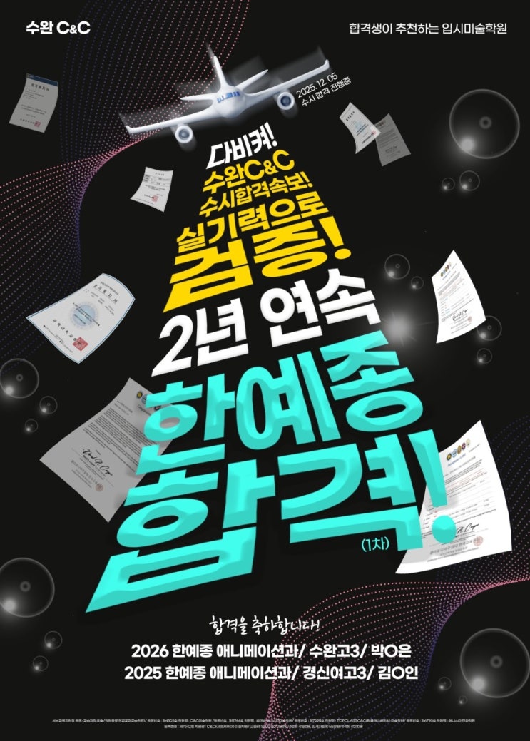 안녕하세요 여러분 오늘 포스팅할 내용은 광주 입시 미술학원 광주 본원 수완 C&C미술학원에서 한예종 1차를 합격하였다고 합니다 무려 2년 연속! 합격을 축하드립니다~ 광주 입시미술학원 광주 본원 수완 C&C미술학원 2년 연속 한예종 합격(1차) 광주 입시 미술학원 광주 본원 수완 C&C미술학원이 실기력으로 다시 한번 결과를 증명했습니다! 올해 역시 작년에 이어 2년 연속 한예종 애니메이션과 합격 놀라운 성과를 이루어 냈습니다 현장에서의 탄탄한 실기 교육 ,학생 한명 한명을 끝까지 끌어주는 지도 시스템 덕분에 이룬 값진 결과 입니다 내신 5등급으로 한예종 1차 합격 꾸준히 증명되는 합격률!! -2026 한예종 애니메이션....... <img src="https://blogthumb.pstatic.net/MjAyNTEyMTBfNjEg/MDAxNzY1MzQ3MzcyMTcw.GVd9d7ZdK13G_s-M7HHmXP2IlRWbatLb-qyT4T9rRYUg.8C0Ecxnki3qblBhdVV42S7Km5ctOuyPrPxLmguiCv7kg.JPEG/KakaoTalk_20251210_150425218_05.jpg?type=s3" />
