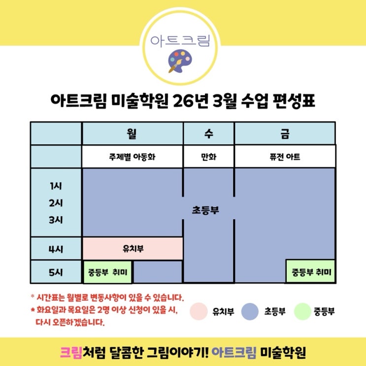 이번 학기는 월,수,금 운영됩니다! (화,목 수업은 없습니다) 요일별로 수업내용이 다르니, 참고해주세요 위 수업달력에서 핑크 색상이 3월수업일, 하늘 색상이 4월수업일입니다! 같은 색상 안에서 세로로~ 요일별로 4회인지 확인하시면 편합니다! (월요일 4회,수요일 4회,금요일 4회 이런식으로요) 매월 커리큘럼은 아트크림미술 네이버 밴드에 업로드 해드립니다 둔원초 정문 픽업은 12:45 / 1:45 / 2:45 가능합니다! (학사일정에 따라 5-10분정도 차이가 있을수있습니다) 경성유치원 픽업은 3:45가능합니다!! 픽업이 필요한 경우, 따로 말씀해주세요! 이상, 아트크림 미술학원이었습니다! 새학기도 잘 부탁드립니다?....... <img src="https://blogthumb.pstatic.net/MjAyNjAzMDVfMTk5/MDAxNzcyNjY5MDMxNDA5.veBLog23v2DcHSjdlHOowRLvB6DgNnGqn5bIROtUwTYg.h8FtA2nmltgaOuqBxMCP7flm9ItdcJikU56hy50Wxh8g.JPEG/IMG%A3%DF9009.JPG?type=s3" />