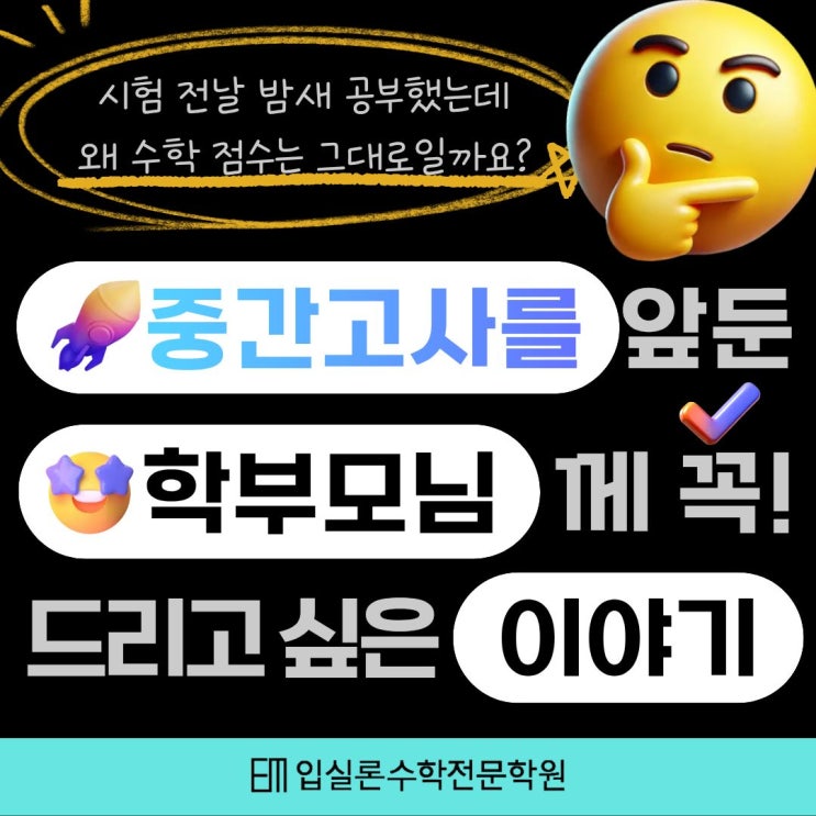 이번엔 진짜 열심히 했어요... 안녕하세요 언제나 정성을 담아 지도하는 입실론 수학학원입니다. 시험을 마치고 돌아온 아이들에게 이런 말 들어보신 적 있으시죠? 이런 이야기를 들을 때 학부모님 마음이 가장 복잡해지는 것 같습니다. 노력했다는 건 분명한데 결과가 따라오지 않으니까요. 수학에서 이런 일이 유독 자주 생기는 데는 이유가 있습니다. 오늘은 그 이유에 대해 알려드리고자 합니다 수학은 '읽는 공부'가 통하지 않습니다. 국어나 사회는 내용을 읽고 이해하면 어느 정도 점수가 나옵니다. 영어도 단어와 문법을 익히면 감이 생기죠. 그런데 수학은 눈으로 이해한 것과 실제로 풀 수 있는 것 사이에 꽤 큰 간격이 있습....... <img src="https://blogthumb.pstatic.net/MjAyNjAzMTJfMTUg/MDAxNzczMzE1ODU2NDIx.YMK2AYfdrnXBa-2nfdzhPTPnLvwSfXzQooEn9AZfHGYg.wxU2yACMtdWSsvOCRpsXmoZcL5gGrFy2BHUL4QVv6p0g.JPEG/1.jpg?type=s3" />