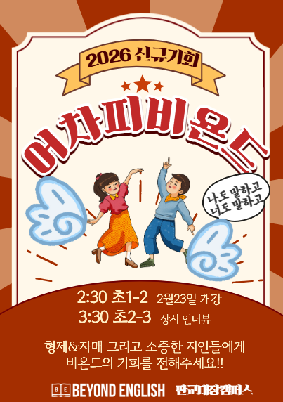 안녕하세요. 바른교육 비욘드 잉글리쉬 입니다. 곧 아이들의 방학도 끝나갑니다. 방학기간에도 스스로 열심히 과제를 해나가던 우리 비욘드 친구들을 한번 자랑해보려고 합니다. 수업이 끝난 뒤에도 교실에 남아 조용히 숙제를 하고 가는 아이들이 있습니다. 모두가 가방을 챙겨 집으로 향할 때, 스스로 자리에 앉아 오늘 배운 내용을 정리하는 그 모습은 참 기특하고 대견합니다. 물론 모든 아이가 꼭 남아서 숙제를 해야 하는 것은 아닙니다. 집에서 더 편안하게 집중하는 아이도 있고, 학원이나 다른 일정이 있는 아이도 있습니다. 중요한 것은 ‘어디서 하느냐’가 아니라 ‘스스로 하느냐’ 입니다. 누가 시켜서가 아니라, 스스로 필요하다....... <img src="https://blogthumb.pstatic.net/MjAyNjAzMDNfMTYx/MDAxNzcyNTI3NjYwMTU4.0Rl4rhdGH5nAEIEHvYn30WoutOvh0v3TK3A8NsgDRcYg.rYu_bC2_k461ZtmSJOukK7mmEfPJ-EzOfE4bz60lbwQg.PNG/2026_%BD%C5%B1%D4%B8%F0%C1%FD.png?type=s3" />
