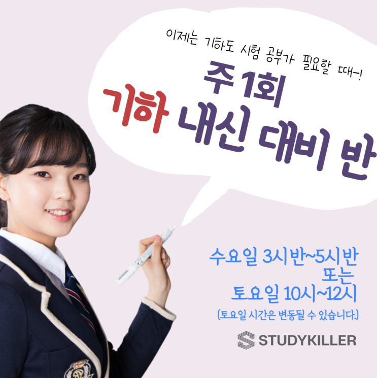분당서현고등수학학원 스터디킬러 입니다. 이제는 기하도 상대평가로 무시할 수 없는 시대가 왔습니다. 기하도 내신대비가 필요한 시기이기에 스터디킬러에서 기하 내신 수업을 진행합니다. 기하 내신대비 반은 주 1회 수요일 3시반~5시반 또는 토요일 10시~12시에 진행합니다. (단, 토요일은 시간이 변경될 수 있습니다.) 기하 내신대비가 필요한 학생들이라면 지금부터 함께 공부해요 <img src="https://blogthumb.pstatic.net/MjAyNjAzMTVfMTE5/MDAxNzczNTY0MjIzODg3.6rx01DPRHF9JvTa2i2nM2zWLKxh-TYkcIu7B_BXbo7Yg.a48Bg-llHX5uRMLbQVACAz3Kf0ksBdyJ7VlmAnAE0jYg.PNG/image.png?type=s3" />