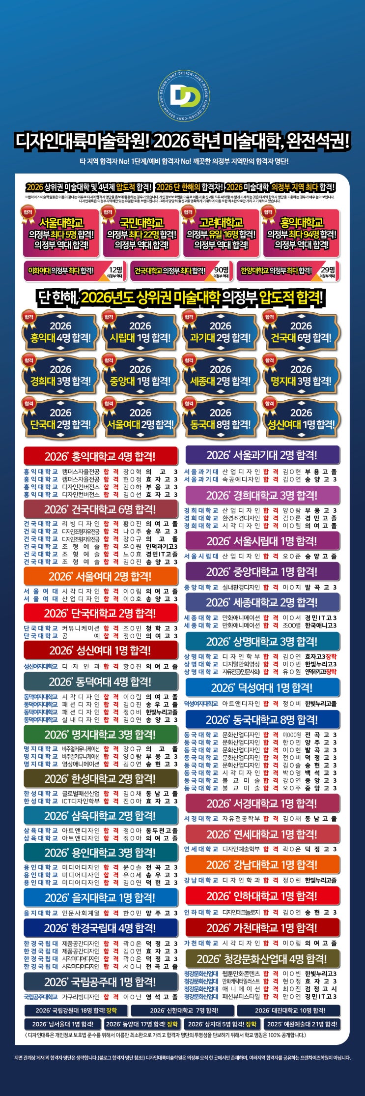 "2026학년도 미술대학 최종 합격을 진심으로 축하합니다" 2026 상위권 미술대학 및 4년제 압도적 합격! 2026 디자인대륙 미술학원 단 한해의 합격자! 2026 홍익대 4명 합격! / 2026 서울시립대 1명 합격! / 2026 서울과기대 2명 합격! 2026 건국대 6명 합격! / 2026 경희대 3명 합격! / 2026 중앙대 1명 합격! 2026 세종대 2명 합격! / 2026 명지대 3명 합격! / 2026 단국대 2명 합격! 2026 서울여대 2명 합격! / 2026 동국대 8명 합격! / 2026 성신여대 1명 합격! <img src="https://blogthumb.pstatic.net/MjAyNjAzMjBfMjE3/MDAxNzc0MDA3NjY4ODc0.-pSJh4h2bos8Ag2ssixMsatx5xOp2vtFABMxK2tfAoAg.tHJ-gwwe0qUo4B_A2Cb7LiPCnNUR6fnHxbMX4eMvrVkg.JPEG/2026%C7%D5%B0%DD%C0%DA.jpeg?type=s3" />